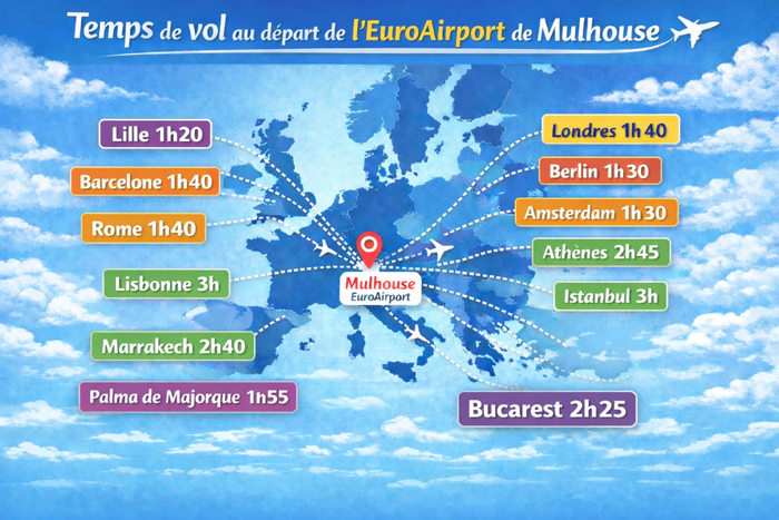 Conséquence logique : après le record historique de 9,6 millions de passagers de 2025, soit une hausse annuelle de 8,1 %, le trafic passagers de l’EuroAirport devrait connaître une baisse en 2026, la direction tablant sur 8,6 millions de passagers cette année (lire notre article). Quid de ce cru 2026, après l’année 2025 qui avait placé Pristina, Londres, Istanbul, Palma et Budapest dans le Top 5 des destinations les plus prisées, avec, comme fer de lance, la compagnie EasyJet et ses 53% de parts de marché ?