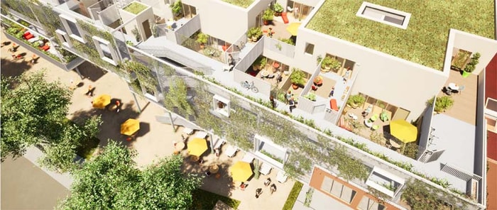 Les deuxième et troisième étages accueilleront, eux, un programme de 23 logements, de 75 m² pour les plus « modestes » à 130 m² les plus spacieux bénéficiant tous de belles terrasses de 12 à 60 m² et d’un accès privatif par une coursive. « Les différents niveaux du bâtiment seront accessibles par des coursives extérieures. Nous avons imaginé une maille végétalisée qui viendra esthétiquement habiller le bâtiment, tout en offrant une barrière naturelle thermique, acoustique et anti-pollution. » Toujours dans cette même logique « d’éco-pensée », les eaux pluviales récupérées permettront d’alimenter ce « cocon vert », l’une des caractéristiques fortes de la future « Fabrique ».