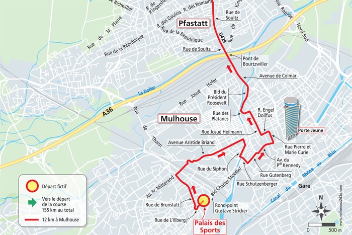 Prenant le départ depuis le Palais des sports, où sera installé le Village Départ, les coureurs parcourront 12 km dans Mulhouse intra-muros. Ils s’élanceront sur le boulevard Stoessel pour rejoindre les rues de l’Illberg et de Brunstatt, l’avenue François Mitterand puis l’avenue Aristide Briand. Bifurquant sur les rues du Siphon, Schutzenberger et Gutenberg, les coureurs emprunteront ensuite l’avenue Kennedy, les rue Pierre et Marie Curie, Engel Dollfus, Josué Heilmann et des Platanes pour rejoindre le boulevard Roosevelt. De là, ils quitteront Mulhouse en direction de Pfastatt, via l’avenue de Colmar, le pont de Bourtzwiller et la rue de Soultz.