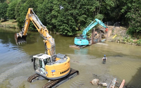 On peut les apercevoir depuis le pont au-dessus de l’Ill, entre Mulhouse et Brunstatt : deux pelleteuses immergées dans l’Ill sont entrées en action, ces jours-ci, pour préparer le terrain aux tuyaux d’acier qui vont y être déposés. Une vision insolite qui illustre l’envergure du chantier en cours du côté de l’Illberg, de Brunstatt et du Rebberg.